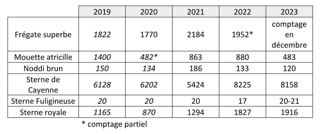 Pour le Noddi brun et la Mouette atricille, on observe une diminution des effectifs nicheurs malgré une capacité d’accueil à priori inchangée. Cependant, l’équipe gestionnaire ne peut affirmer pour le moment si cette diminution est liée à un déclin réel des populations ou à une variation interannuelle comme cela a déjà été observée par le passé.