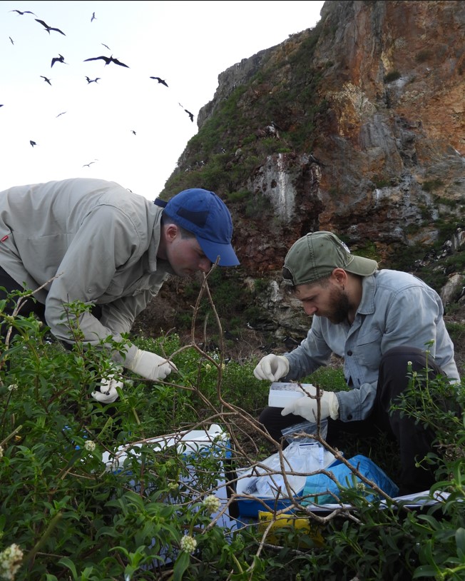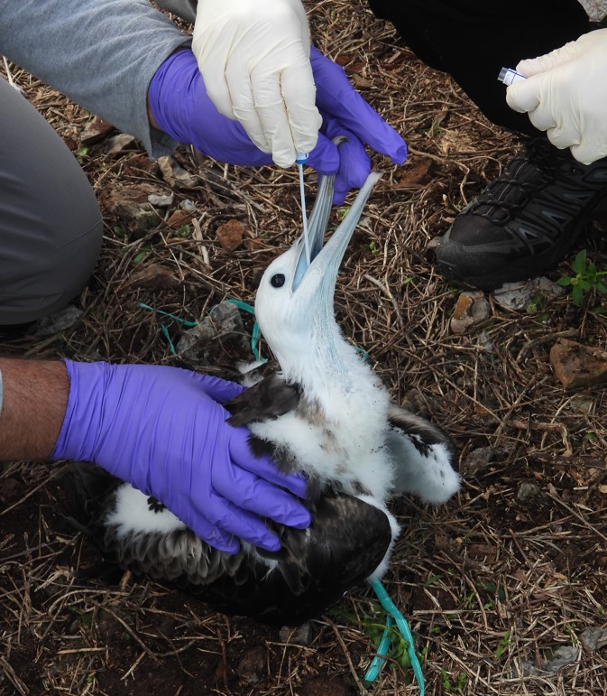 Dans la lignée d’une collaboration entamé en 2015 pour étudier l’herpès virus présent sur les poussins de frégates de l’île, une mission a été organisée avec l’équipe gestionnaire pour effectuer des prélèvements sur 10 individus. Les échantillons récoltés serviront à mieux comprendre les mécanismes influençant l’apparition de cette maladie, probablement lié à la contamination au mercure.