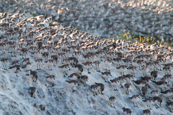 Les deux iles rocheuses de la réserve sont donc des sites très favorables pour accueillir ces espèces à marée haute et particulièrement lors des forts coefficients de marée. Les roches nues sont alors recouvertes de milliers d’individus le temps de quelques heures, offrant un spectacle impressionnant. On y retrouve principalement du Bécasseau semipalmé (Calidris pusilla), mais viennent s’y mêler également du Bécasseau minuscule (Calidris minutilla), Bécasseau sanderling (Calidris alba), Tournepierre à collier (Arenaria interpres) et Gravelot semipalmé (Charadrius semipalmatus)…