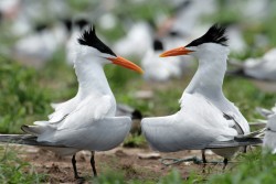 Après l’éclosion de l’unique œuf de chaque couple, le jeune se dirige vers le centre de la colonie. Tous les jeunes y sont rassemblés sous forme de « crèches » jusqu’à ce qu’ils puissent prendre leur envol. Sur l’île du Grand-Connétable, ces « crèches » sont mixtes regroupant les poussins des S. Royales et des S. de Cayenne. Ceci permet de limiter la prédation.