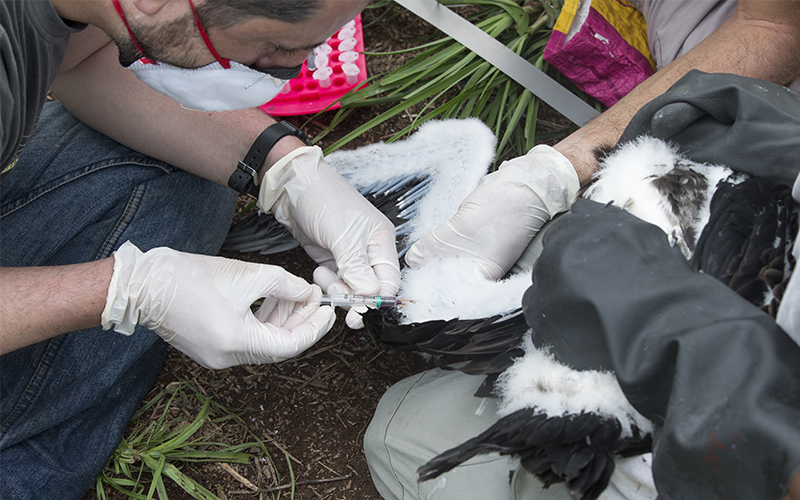 Depuis plusieurs années, la colonie de Frégates du Connétable est atteinte d’un Herpes-virus qui touche les poussins, entrainant une mortalité importante. Cette situation soulève de nombreuses questions sur les mécanismes qui entrainent l’apparition du virus chez les poussins. Pour répondre à ces questions, Manrinco Sebastiano, de l’université d’Anvers, a débuté depuis quelques mois une thèse sur ce sujet. Lors de deux missions en juin, nous avons procédé aux premiers prélèvements de sang, qui une fois analysés, devraient apporter une première série de réponses.