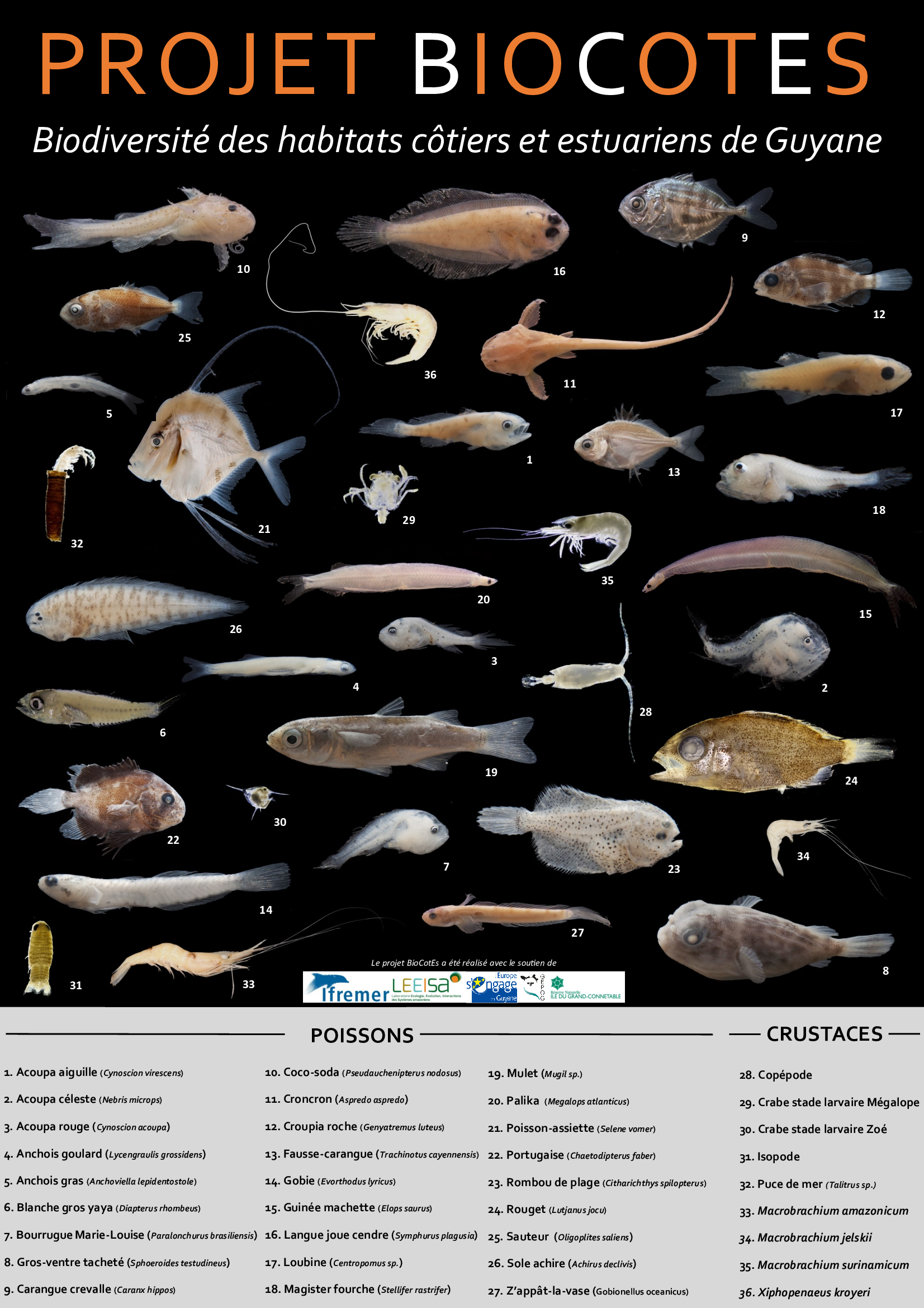 Le projet BioCotEs prenant fin en 2022, nous invitons tous les amoureux de la mer à télécharger gratuitement le poster du projet sur le site internet de la Réserve ou sur https://wwz.ifremer.fr/guyane_eng/Projet-BioCotEs