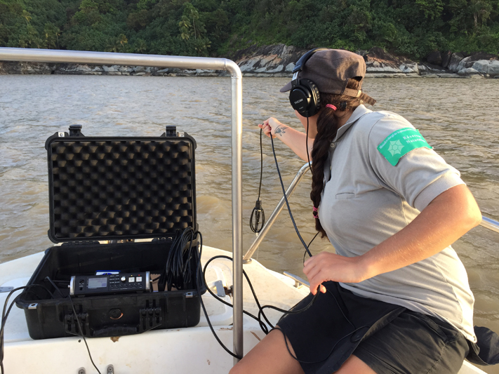 Afin de poursuivre nos efforts communs et de mieux comprendre cette espèce, la Réserve utilise un hydrophone omnidirectionnel qui, lorsqu’il est immergé, permet d’enregistrer les sons émis par de nombreux organismes marins dont le Dauphin de Guyane (dans un rayon de plusieurs centaines de mètres). Dès la première utilisation de ce matériel en 2014, les résultats ont été très positifs. Des clics et sifflements ont été enregistrés à plusieurs reprises d’individus en déplacement et en alimentation. Le recours aux méthodes acoustiques se révèle donc très efficace pour le suivi d’animaux discrets et évoluant dans un environnement marin peu accessible et turbide. Nous poursuivons donc nos efforts en vue de comparer nos résultats avec ceux obtenus au Brésil, mais aussi d’envisager le déploiement d’hydrophones fixes qui enregistreraient en continu et de manière autonome le milieu marin.