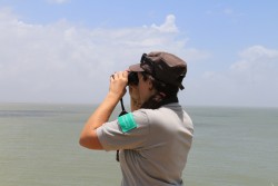 L’équipe de la Réserve assure de nombreuses heures d’observation de la faune marine depuis l’île du Grand-Connétable, notamment du Dauphin de Guyane (Sotalia guianensis). A chaque mission, une surveillance de 30 minutes est réalisée aux quatre points cardinaux de l’île (lorsqu’ils sont accessibles et non occupés par les oiseaux en reproduction). L’observateur suit un protocole et relève les conditions météorologiques, de mer et note toutes les observations réalisées (espèce, nombre d’individus, présence de jeunes, activité…). Ce travail est standardisé et permet de noter la présence ou l’absence de dauphins et d’évaluer l’hypothèse d’un effet de la saisonnalité sur l’espèce. A ce jour, les observations sont plus fréquentes entre le mois de juin et décembre ; un constat pouvant cependant être lié à une meilleure détection des animaux en saison sèche.