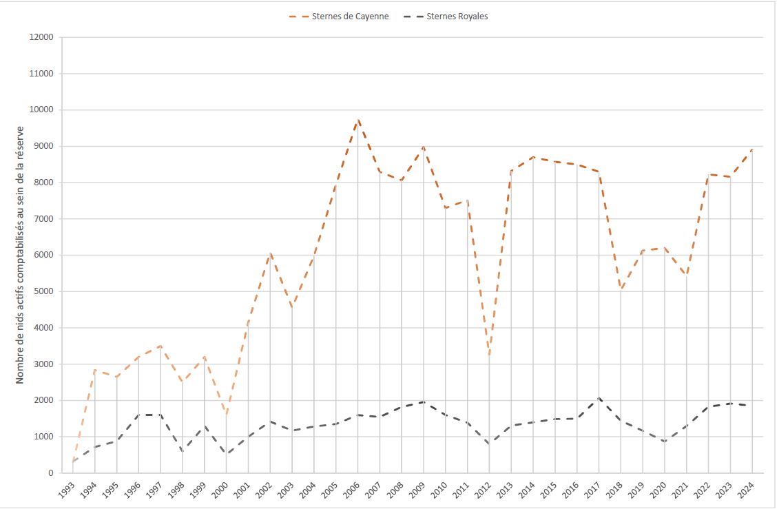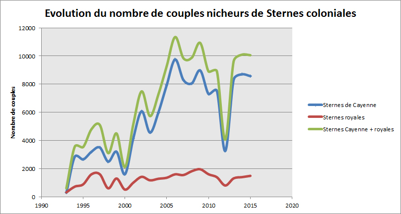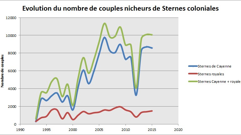 Les effets de la gestion de la Réserve Naturelle sont mesurables par l’augmentation des effectifs nicheurs des sternes coloniales. En effet, en 1993, environ 300 couples reproducteurs étaient dénombrés pour ces deux espèces d’oiseaux, puis on atteignît 9 753 couples de Sternes de Cayenne en 2006 et 1 956 couples de Sternes royales en 2009. En d’autres termes, depuis le classement de l’île en Réserve Naturelle, l’effectif de la Sterne de Cayenne a été multiplié par 30 (en 2006) et celui de la Sterne royale par 7 (en 2009). L’entretien des plateformes de nidification et la préservation du site contre le dérangement semblent concourir au succès reproducteur de la colonie et donc à l’augmentation de sa taille.