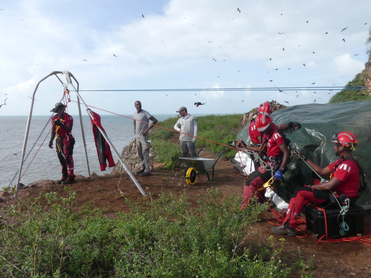 Ainsi, un projet ambitieux de restauration écologique a été mis en place pour aménager la zone de reproduction des Sternes de Cayenne et des Sternes royales, qui forment chaque année une grande colonie mixte sur l’île. L’objectif est d’assurer un espace favorable aux couples et aux poussins en limitant la repousse des végétaux envahissants. Inspiré en partie des dispositifs artificiels mis en place pour la nidification des laridés en France (îlots flottants), ou ailleurs dans le monde, plus de 7 tonnes de matériaux (substrats argileux et chimiquement neutres) ont été acheminés sur l’île le 30 novembre 2021. Ces matériaux serviront à installer deux placettes-tests de reproduction de 100m² pour la prochaine saison qui débutera en avril 2022. Il s’agira ensuite de déterminer quel est le matériau qui répond au mieux aux besoins écologiques de ces deux espèces. Pour ce faire, un important dispositif de suivi sera mis en œuvre pour étudier le succès reproducteur et les comportements des sternes, ainsi que la capacité des dispositifs à contenir la repousse de la végétation. Si les résultats sont concluants, une plateforme de près de 1000 m2 sera aménagée.