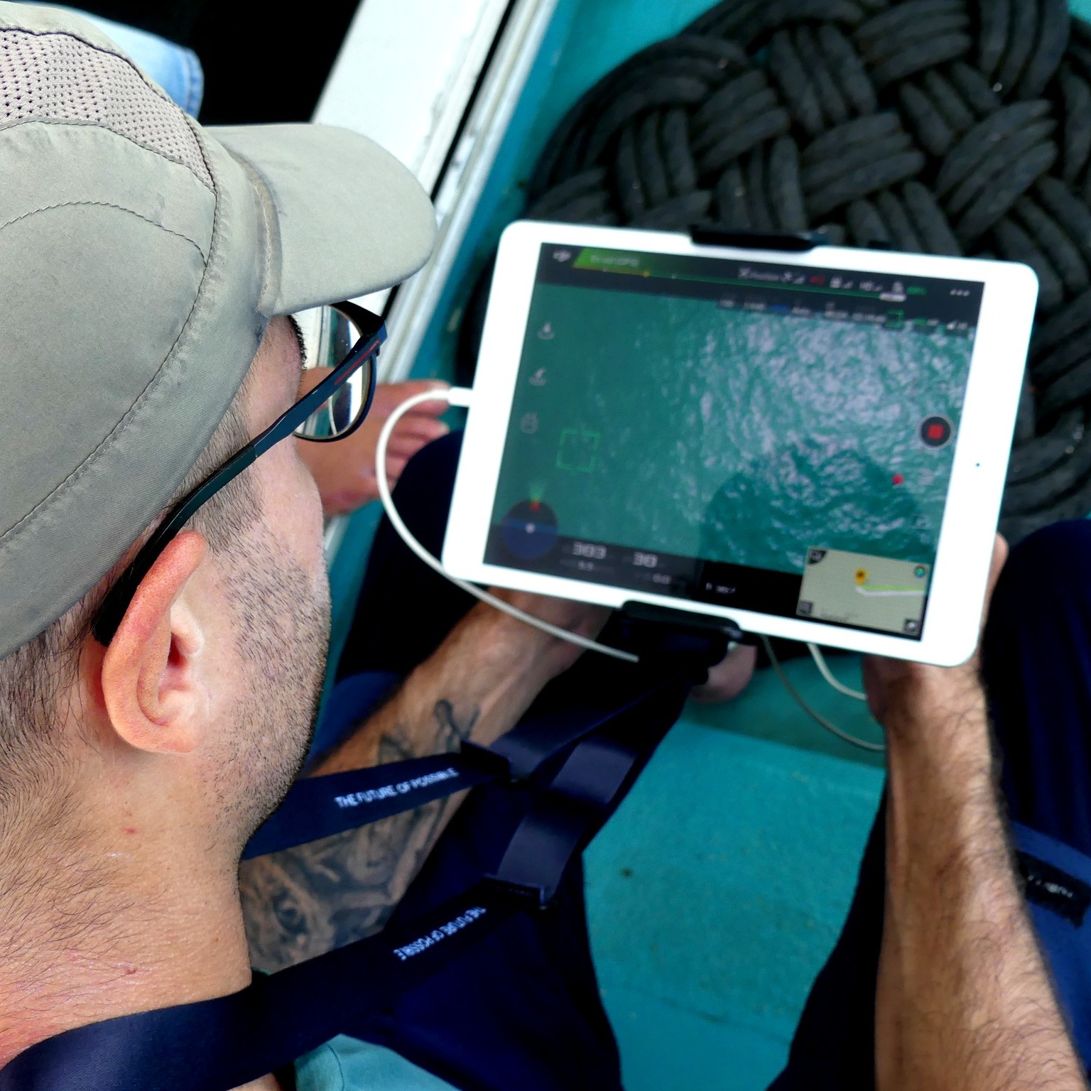 Ainsi, au cours des trois jours, une quinzaine de Raies mantas a été détectée sur la zone. Si aucun individu n’a pu être approché par les plongeurs malgré les conditions favorables, le suivi par drone a en revanche permis de réaliser de superbes images aériennes. En complément, une surveillance visuelle permettait de détecter les sauts des animaux ainsi que les individus très proches du bateau.