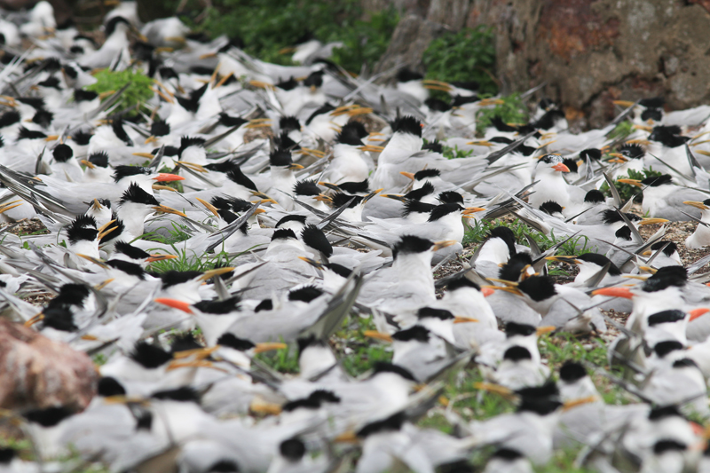La saison de reproduction bat son plein sur l’île du Connétable. Tous les couples d’oiseaux reproducteurs sont présents sur l’île. Durant cette période, l’équipe de la réserve effectue des suivis sur les populations nicheuses. Deux types de paramètres sont étudiés : les effectifs et le succès reproducteur. Les effectifs nous renseignent sur la taille de la population, tandis que le succès reproducteur permet d’estimer le nombre de jeunes qui arriveront à s’envoler à la fin de la saison. Ces deux paramètres sont essentiels pour bien comprendre la dynamique des populations présentes sur l’île. Concernant les effectifs, les Sternes royales et les Sternes de Cayenne font l’objet d’un comptage précis et régulier. Cette année, l’équipe a décidé de faire des comptages à chaque mission hebdomadaire afin de déterminer l’évolution de l’arrivée des couples sur l’île au cours de la période de reproduction. Le pic fut atteint le 28 mai avec 1 487 couples de S. royales installés, soit près de 3 000 S. royales nicheuses. Concernant les Sternes de Cayenne, l’évolution de l’arrivée des couples de cette espèce est beaucoup plus progressive bien que le pic soit atteint à la même date, avec un total de 8 572 couples. Le 28 mai, plus de 10 000 couples de «Sternes blanches» étaient donc installés sur l’île ! Autre espèce à faire l’objet d’un comptage exhaustif, la Frégate superbe. Près de 1 200 couples se sont reproduits à la fin de l’année 2014 ; c’est autant de nids que nous pouvons observer aujourd’hui au «stade juvénile» pour la grande majorité. Les autres espèces nicheuses en revanche ne font pas l’objet d’un comptage exhaustif, mais d’une simple estimation des effectifs. Dans le prochain Î-Connétable, nous évoquerons cette fois-ci les suivis effectués pour connaitre le succès reproducteur des espèces.